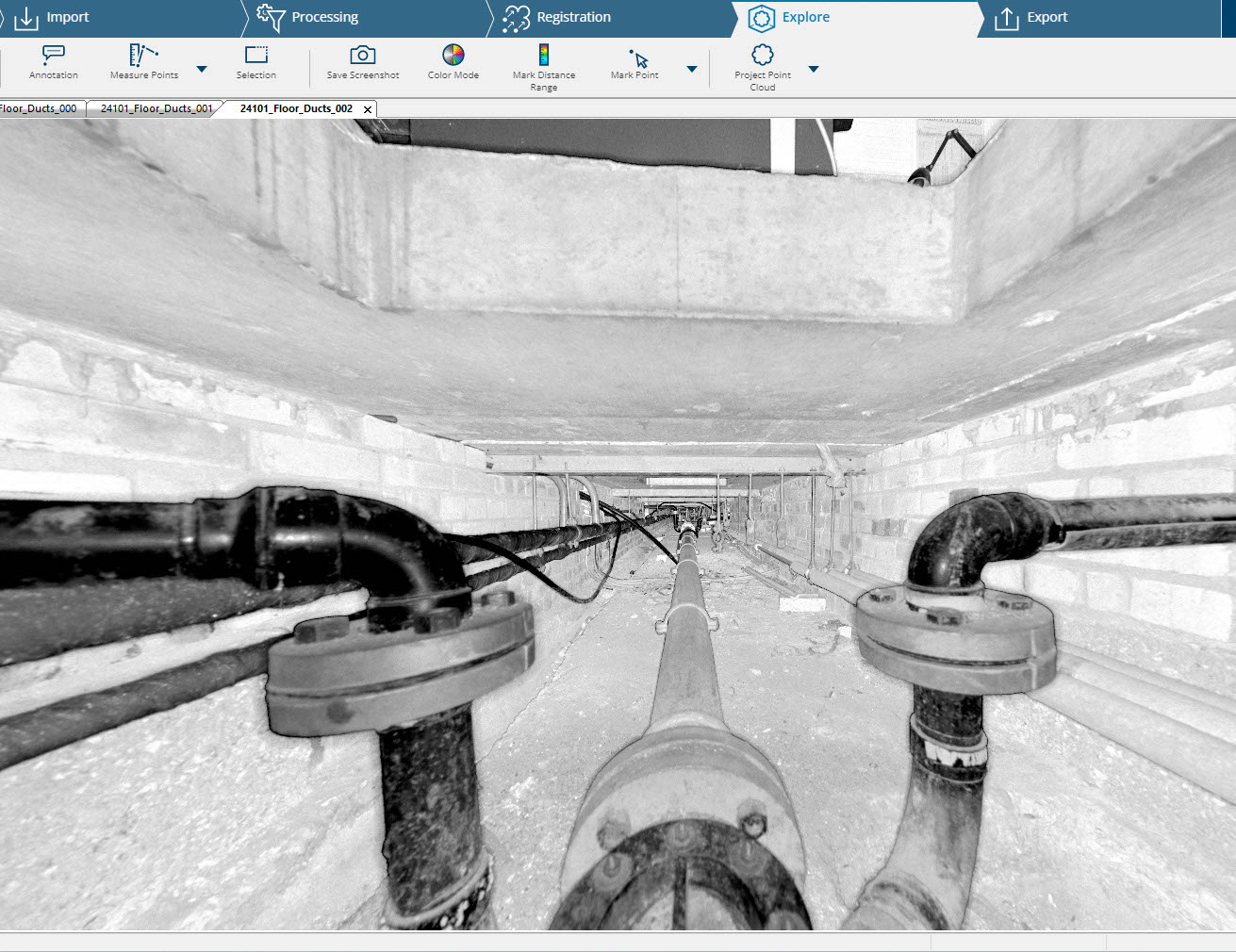 Using old scans via Faro Webshare, we scanned at eye level, then lowered the scanner to floor level and finally into the ducts – carefully. Repeat across the site. Afternoon spent registering everything and stitching it to the previous survey.